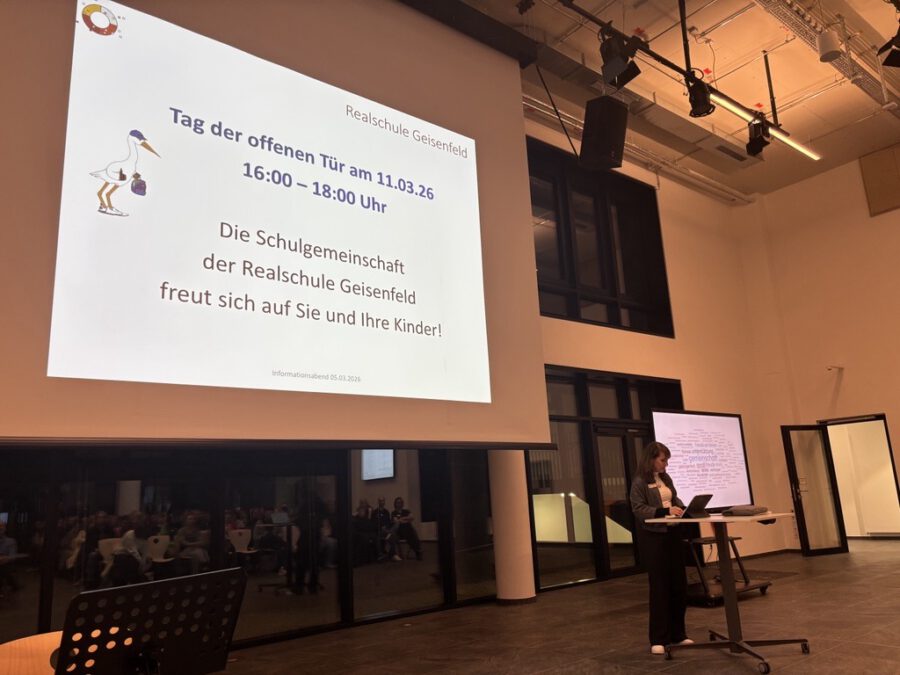 In der vollbesetzten Aula stellte Realschuldirektorin Sabine Billinger die Realschule Geisenfeld und die Formalitäten für den Übertritt an die Realschule vor.