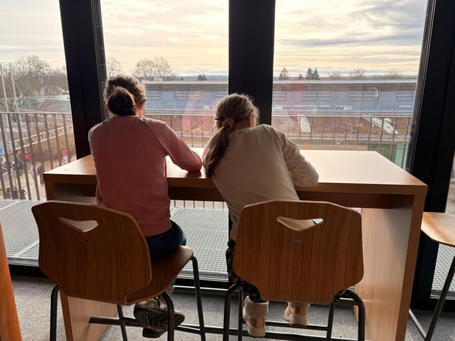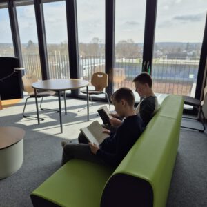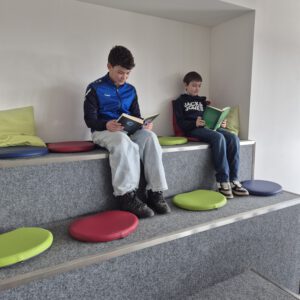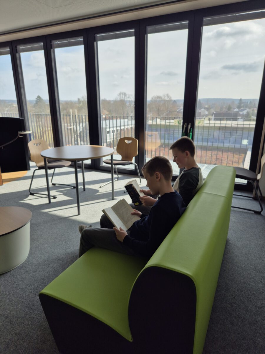 Die Schülerbücherei der Staatliche Realschule Geisenfeld ist weit mehr als nur ein Raum voller Bücher – sie ist ein lebendiger Treffpunkt für unsere Schulgemeinschaft und ein echtes Schmuckstück unseres Neubaus, den wir erst im letzten Jahr beziehen durften. Mit viel Liebe zum Detail geplant und komplett neu ausgestattet, lädt die Bücherei auf zwei Ebenen zum Schmökern, Lernen und Entdecken ein. Das bunte und abwechslungsreiche Mobiliar sowie die große Fensterfront mit Ausblick sorgen für eine Wohlfühl-Atmosphäre, die zum Verweilen einlädt.