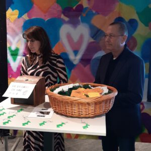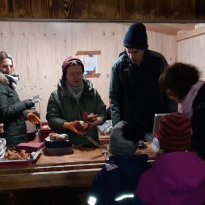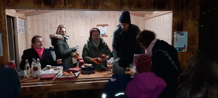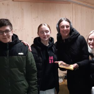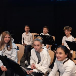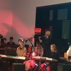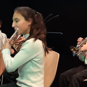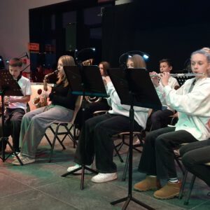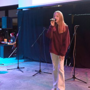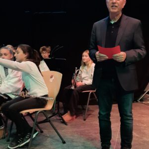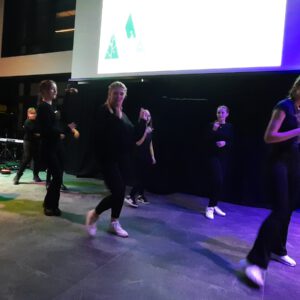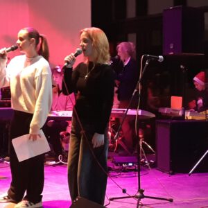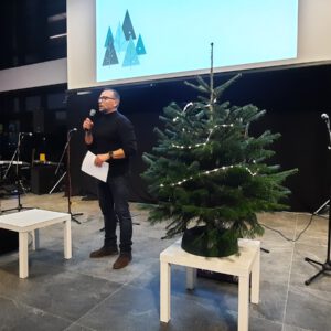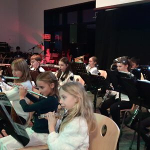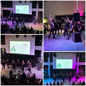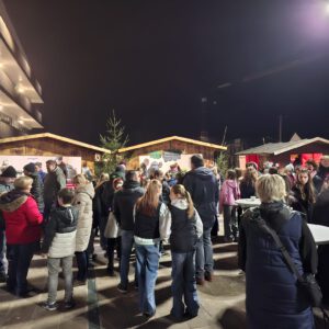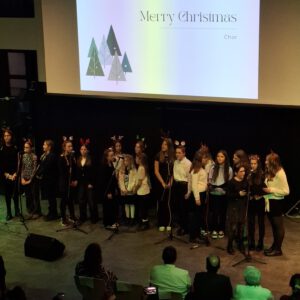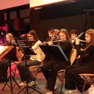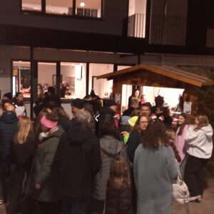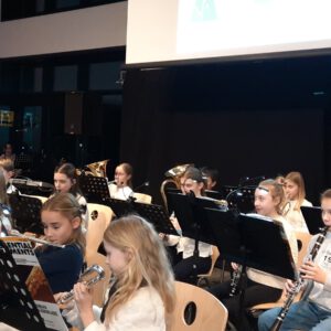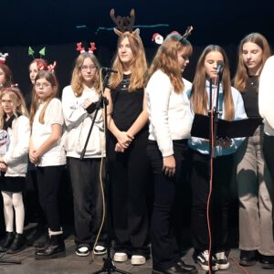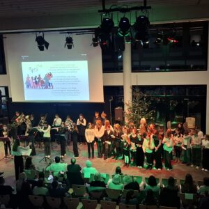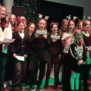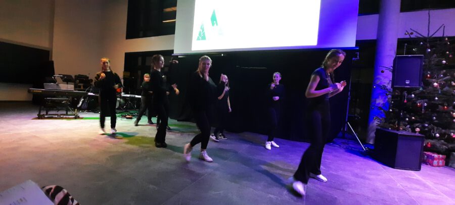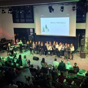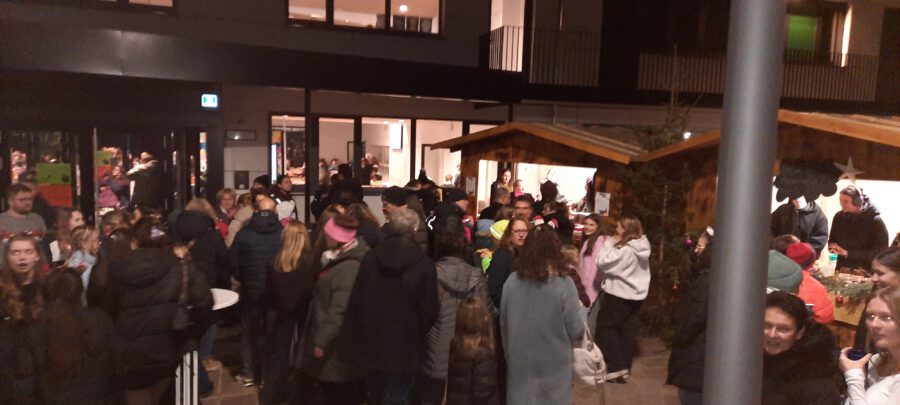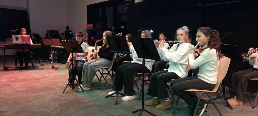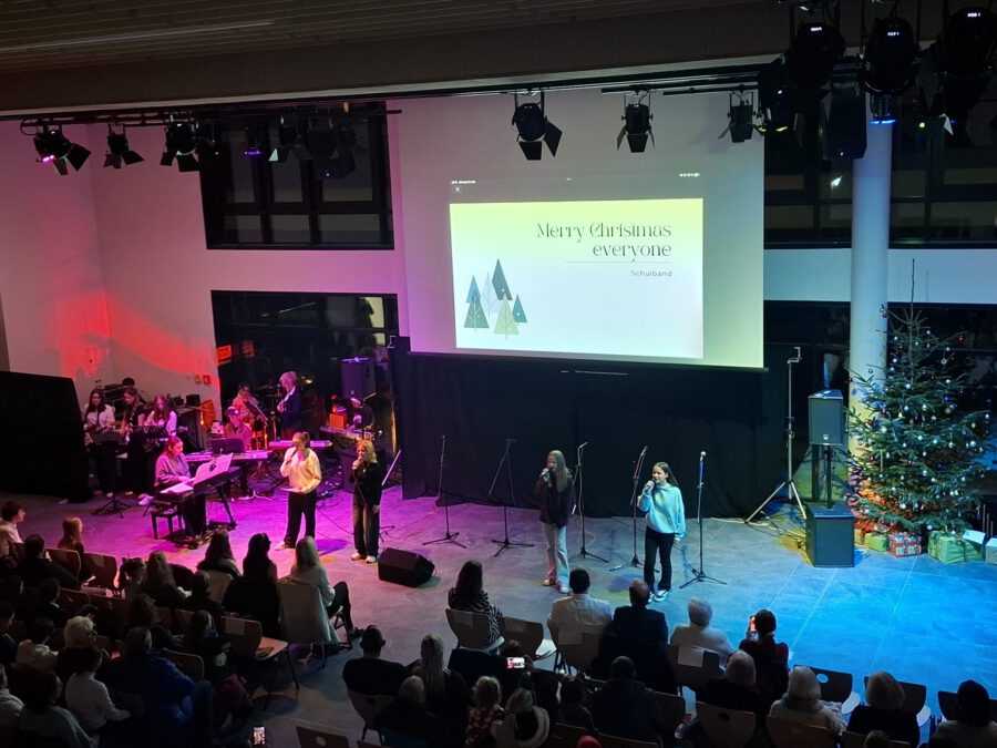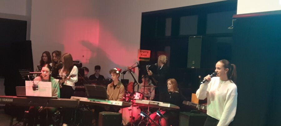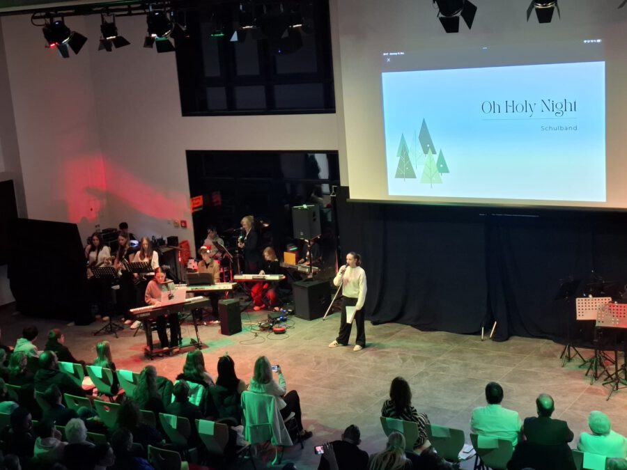 Der Chor umrahmt stimmgewaltig und besinnlich mit „Kommt wir zünden Kerzen an“ und „Merry Christmas“ die Christbaumversteigerung, deren Erlös für einen guten Zweck gespendet wird. Der Nikolaus-Auktionator, Andreas Grünert, versteigert nicht nur Christbäume, sondern auch etliches an Zubehör: Christbaumführerschein, Garantieurkunde-110%-Plastifrei, Lichterkettenententwirrer-Zertifikat etc. Natürlich kommt alles unter den weihnachtlichen Hammer und eine erkleckliche Summe zustande. „Merry Christmas everyone“ wünscht die Schulband anschließend frohgelaunt den anwesenden Gästen und glücklichen Christbaumbesitzern. Eine beeindruckende, kreative und künstlerisch sehr inspirierte Performance bietet die Zumba Gruppe zu den Melodien von „Bachata“ und dem K-Pop Song „Golden“. Ein Medley aus bekannten Weihnachtsliedern aus den kraftvollen Instrumenten der Big Band lässt Jung und Alt in ihren Erinnerungen schwelgen, die von „Oh holy night“, von der Schulband mit der ausdruckstarken Stimme von Antonia Schrott schon sehr nah an Weihnachten herangetragen werden. Für all den Fleiß, die Mühe, unzählige Proben, leidenschaftliche Hingabe aller Beteiligten, der Musiker, Techniker, Helfer, Bastler und Lehrer bedankte sich Schulleiterin Sabine Billinger aufs Herzlichste. Sie wünscht allen Anwesenden eine besinnliche Zeit, Zeit mit den Liebsten, mit der Familie, Zeit zum Verweilen und Genießen des Augenblicks. Diesen gemeinsamen Moment genießen alle Besucher mit der Big Band, allen Künstlern und dem Klassiker „Oh du fröhliche“. Ein perfektes Konzert setzt hier nochmals einen gemeinsam erlebten und gesungenen Schlusspunkt: Ein frohes Fest für alle! (A. Glaser)