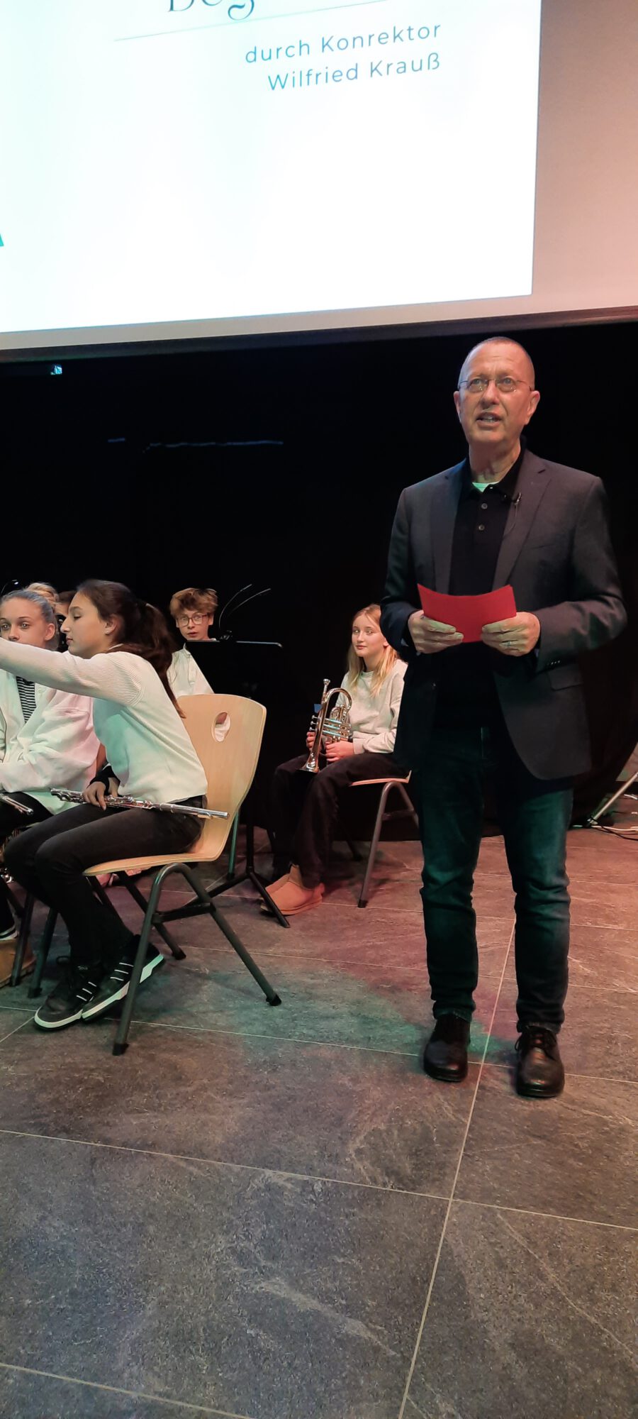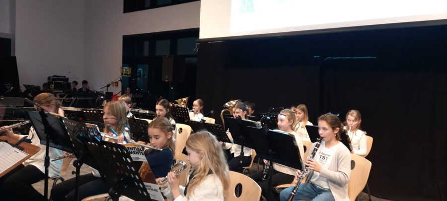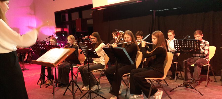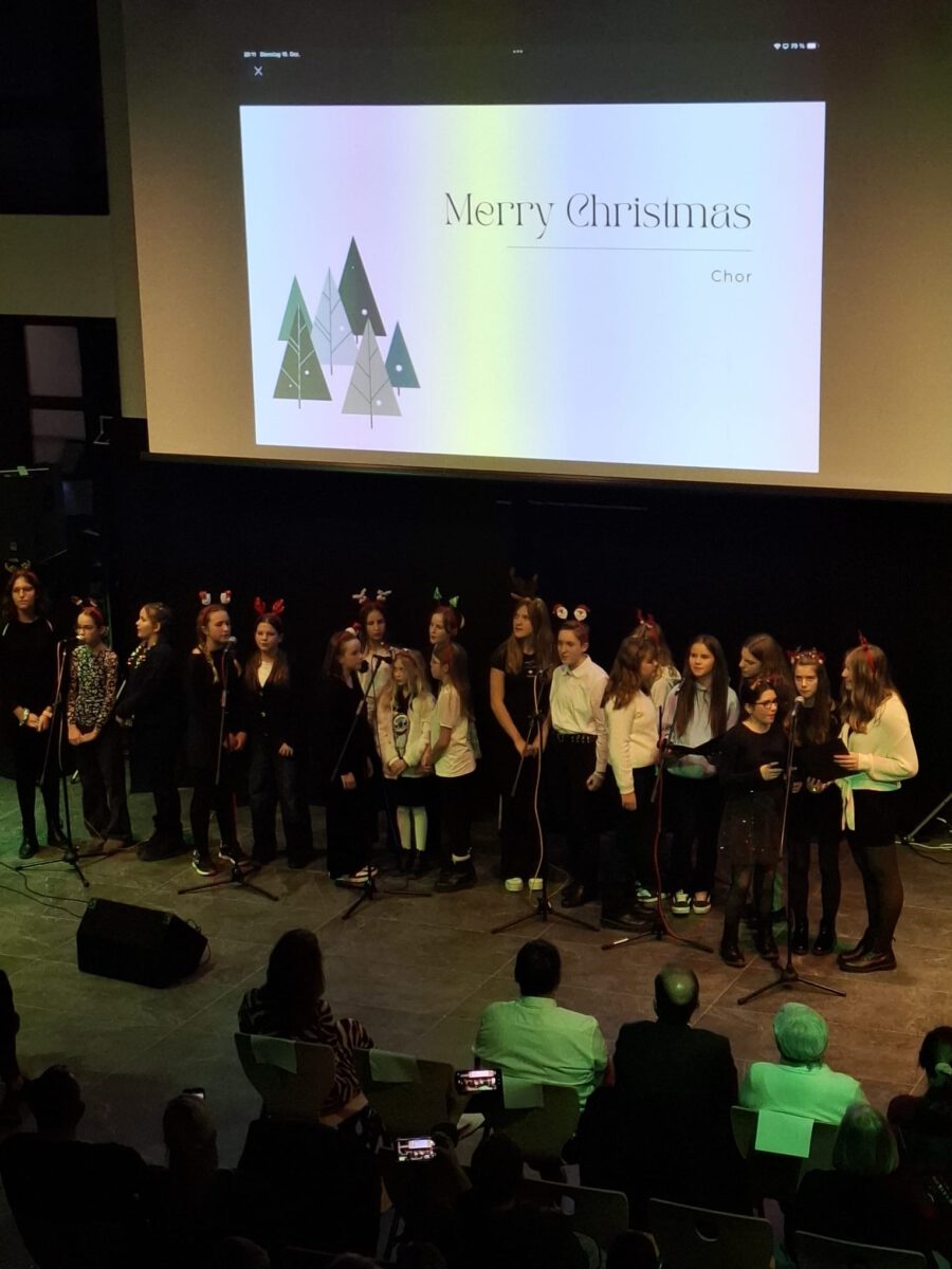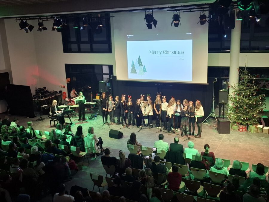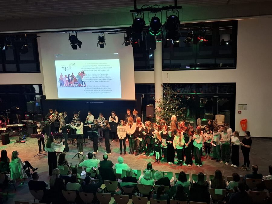 Weihnachten – seit Tagen schwirren Sänger, Musiker, Techniker und ihre Musiklehrer aufgeregt und voller Vorfreude auf das Konzert durch die neue Aula. Wird alles funktionieren? Werden wir performen? Na, klar, wie immer ist das Weihnachtskonzert ein bombastischer Erfolg, das die Zuhörer in ihren Bann schlägt, Weihnachtsstimmung entflammt und allen ein wonniges Gefühl mit nach Hause gibt. Die Bläserklassen der 6b bringen das Publikum mit einer Weihnachtsfanfare in Stimmung und bereiten den Weg für Konrektor Wilfried Krauß, der Paul Weber, den Bürgermeister der Stadt Geisenfeld und Frau Henriette Staudter, die Patin der „Schule ohne Rassismus – Schule mit Courage“, sowie alle Gäste begrüßt. Er wünscht Weihnachtsfreude zu erleben, eine Zeit ohne Hektik, eine Zeit des Zuhörens und miteinander Sprechens, um Vertrauen und Gemeinschaft zu schaffen.
