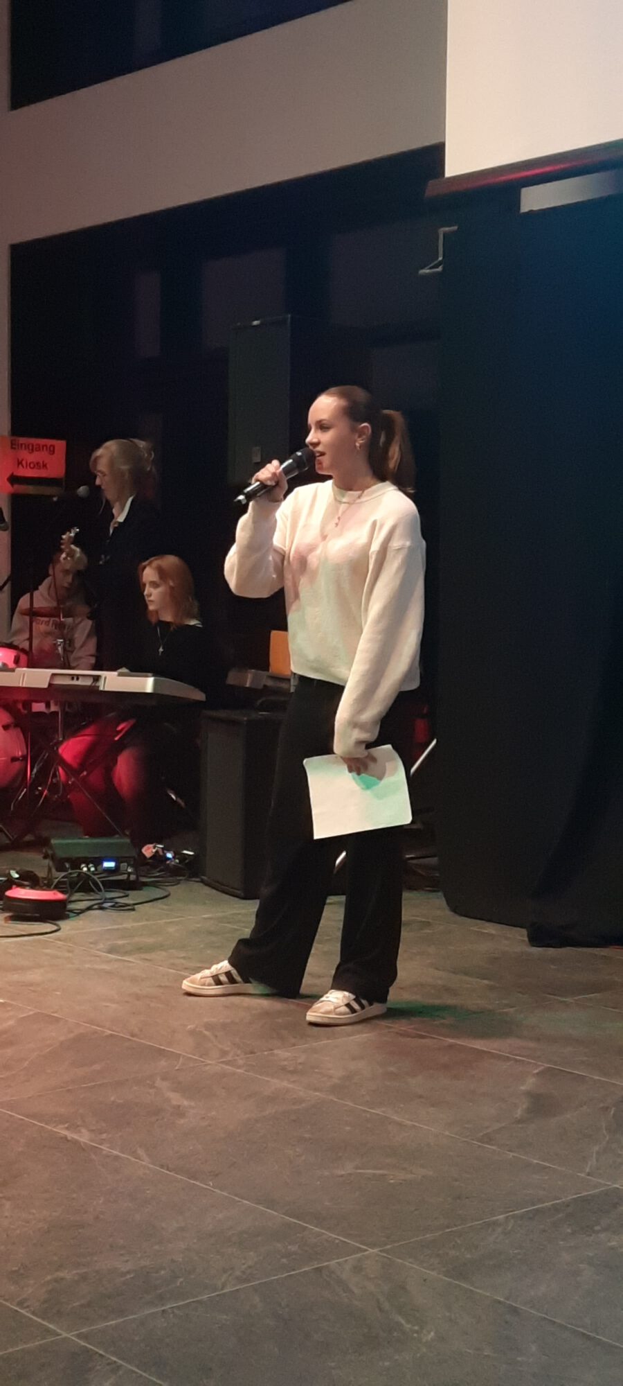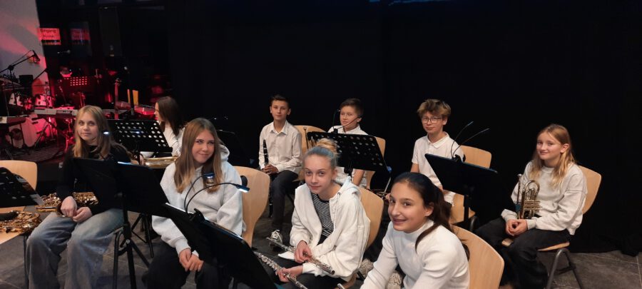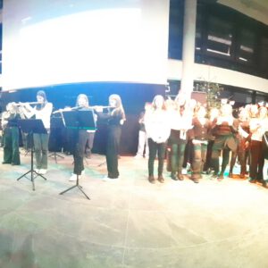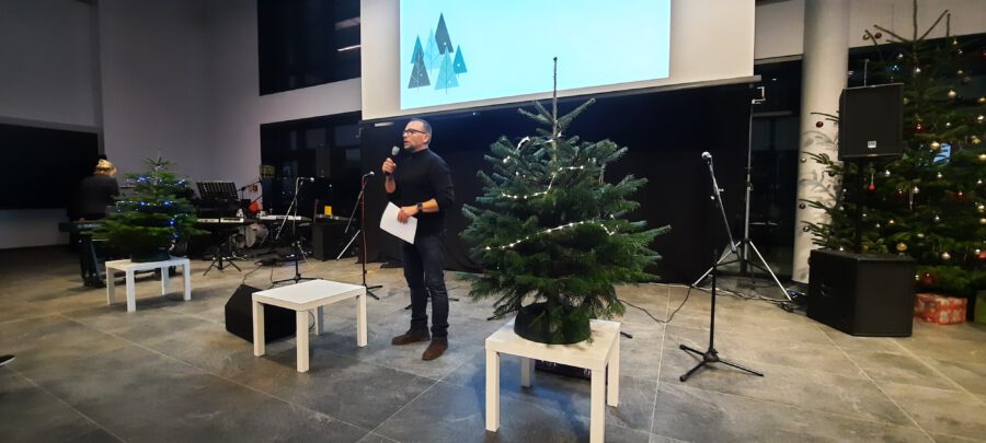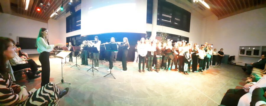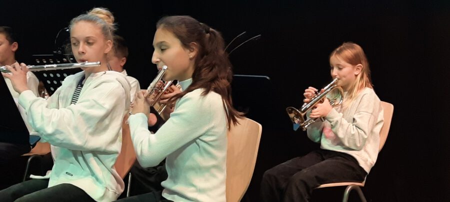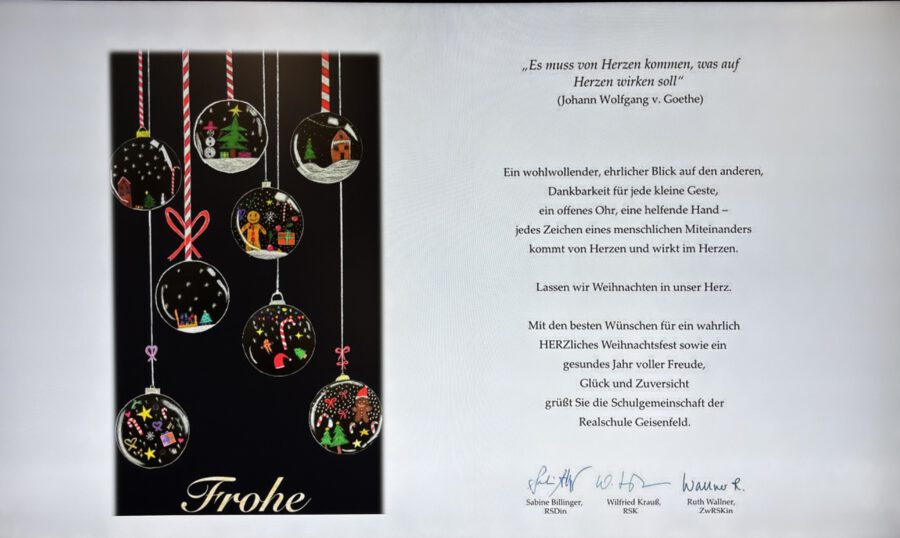 Weihnachten – seit Tagen schwirren Sänger, Musiker, Techniker und ihre Musiklehrer aufgeregt und voller Vorfreude auf das Konzert durch die neue Aula. Wird alles funktionieren? Werden wir performen? Na, klar, wie immer ist das Weihnachtskonzert ein bombastischer Erfolg, das die Zuhörer in ihren Bann schlägt, Weihnachtsstimmung entflammt und allen ein wonniges Gefühl mit nach Hause gibt. Die Bläserklassen der 6b bringen das Publikum mit einer Weihnachtsfanfare in Stimmung und bereiten den Weg für Konrektor Wilfried Krauß, der Paul Weber, den Bürgermeister der Stadt Geisenfeld und Frau Henriette Staudter, die Patin der „Schule ohne Rassismus – Schule mit Courage“, sowie alle Gäste begrüßt. Er wünscht Weihnachtsfreude zu erleben, eine Zeit ohne Hektik, eine Zeit des Zuhörens und miteinander Sprechens, um Vertrauen und Gemeinschaft zu schaffen.