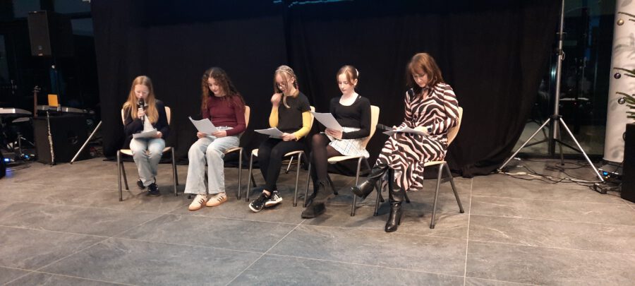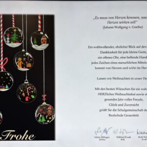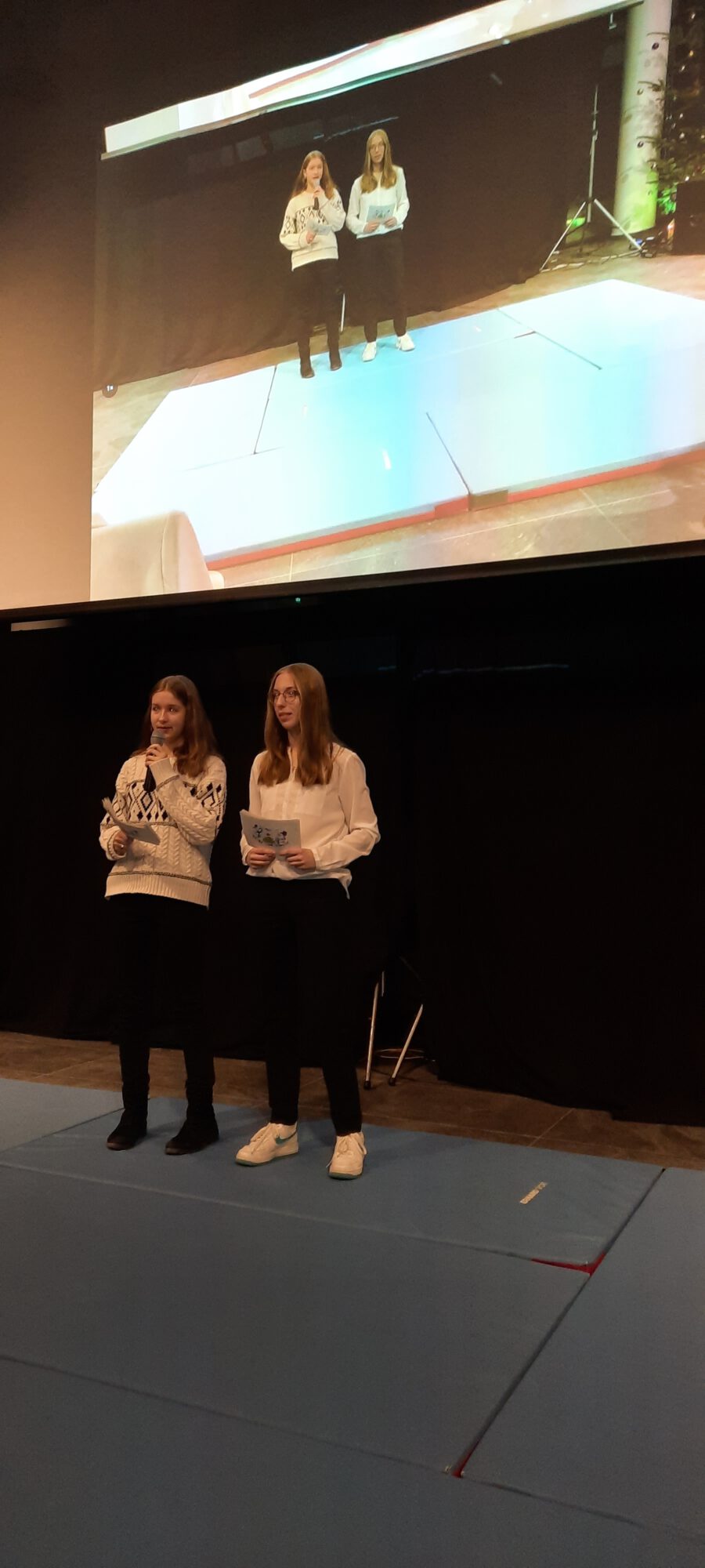 „Kling Glöckchen, We wish you a merry Christmas“ (6b) und die Bläser der 5b mit „Jingle Bells“ und dem traditionellen „Morgen kommt der Weihnachtsmann“ zaubern erste Klänge für das Fest auf die Bühne. Dann moderieren Anna und Johanna, die beiden eloquenten Moderatorinnen, die Turnerinnen an, die zu den Klängen von „Wonderful Dream“ akrobatische Kunststücke darbieten. „A million dreams“ von Pink wird von ihnen in einem „Tanz mit Band“ zum Leben erweckt, eine fantastische Interpretation des ausdrucksstarken Songs. Weihnachten ist Geschichten-Zeit, die Lesesieger der 6. Jahrgangsstufe sind wahre Meister darin und werden für ihre Kunst geehrt. Sie beweisen ihr beindruckendes Können mit „dem kleinen Weihnachtswunder“ – einer tiefgründig-ergreifenden Geschichte, welche die Zeit füreinander, das Beisammensein als Herz der Weihnacht erkennt.